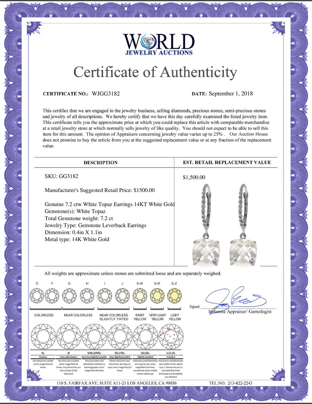 All property is sold “AS IS”, and ALL SALES ARE FINAL. Property is open to thorough public inspection. It is the Bidder’s responsibility to determine condition, age, genuineness, value or any other determinative factor. WJA may attempt to describe the merchandise in advertising and on the Internet but makes no representations. In no event shall WORLD JEWELRY AUCTION be held responsible for having made or implied any warranty of merchantability or fitness for a particular purpose. Bidder shall be the sole judge of value.