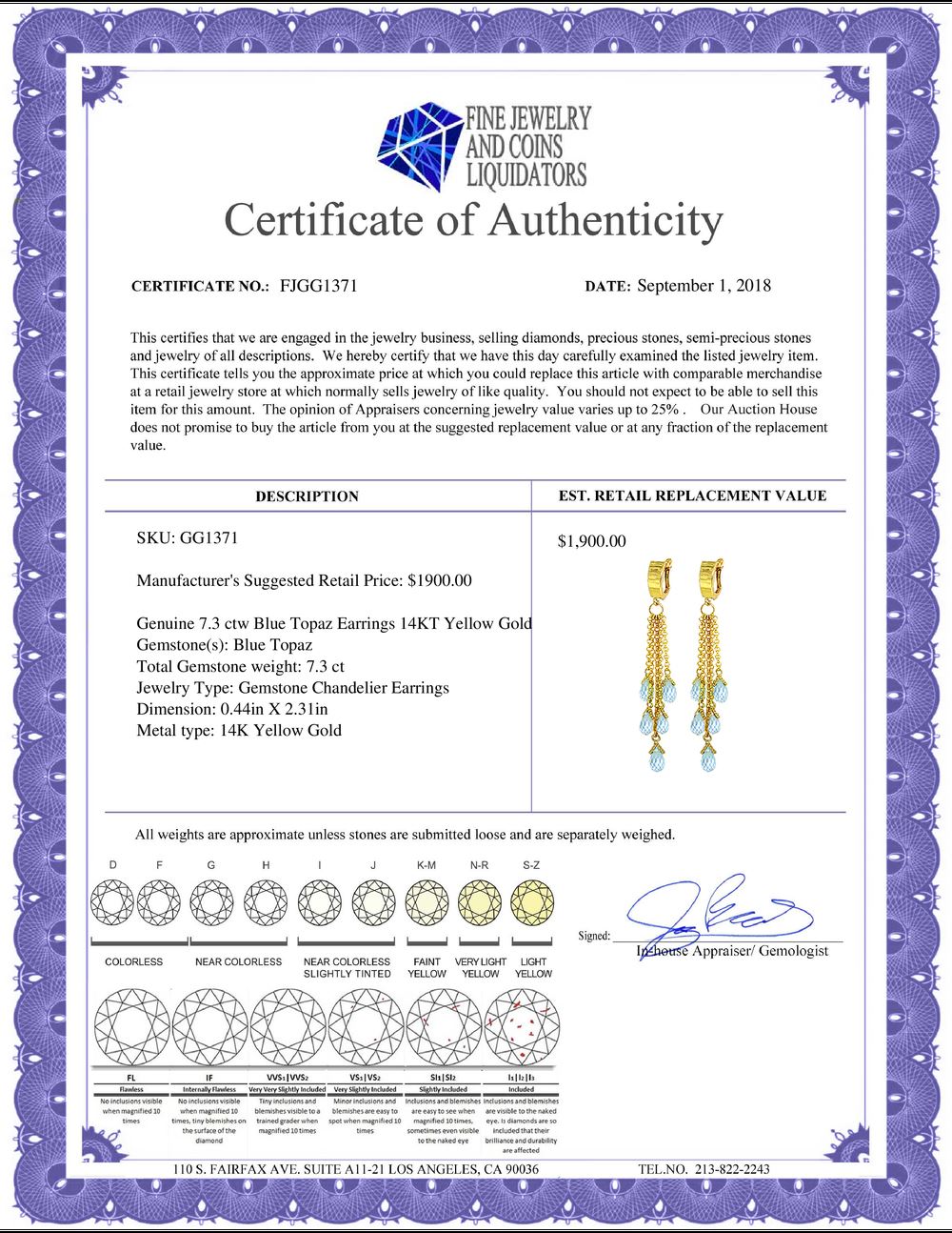 REF-62K3V - SKU: GG1371 ---- Genuine 7.3 ctw Blue Topaz Earrings 14KT Yellow Gold