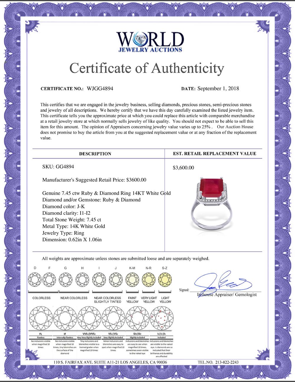 All property is sold “AS IS”, and ALL SALES ARE FINAL. Property is open to thorough public inspection. It is the Bidder’s responsibility to determine condition, age, genuineness, value or any other determinative factor. WJA may attempt to describe the merchandise in advertising and on the Internet but makes no representations. In no event shall WORLD JEWELRY AUCTION be held responsible for having made or implied any warranty of merchantability or fitness for a particular purpose. Bidder shall be the sole judge of value.