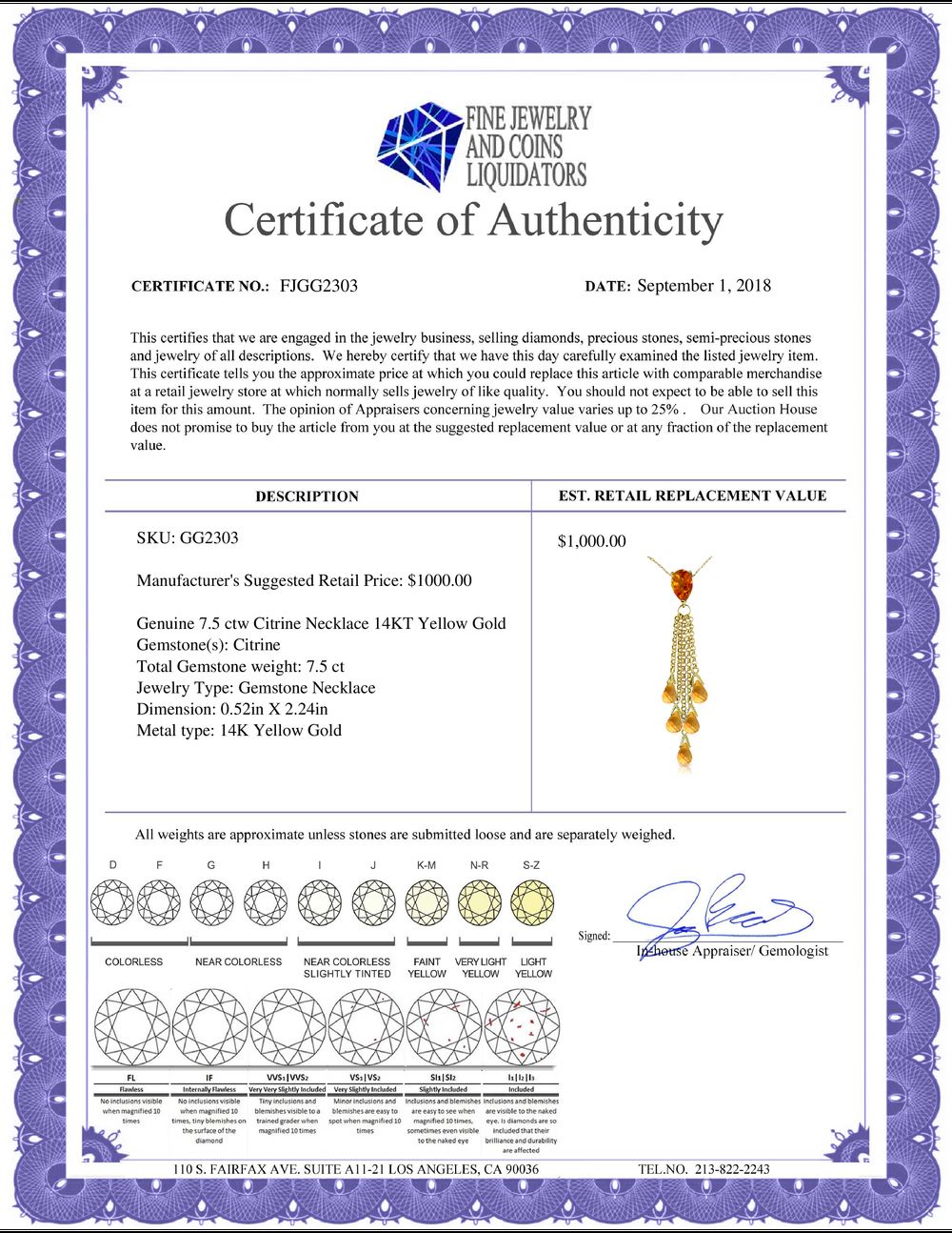 REF-32T8A - SKU: GG2303 ---- Genuine 7.5 ctw Citrine Necklace 14KT Yellow Gold