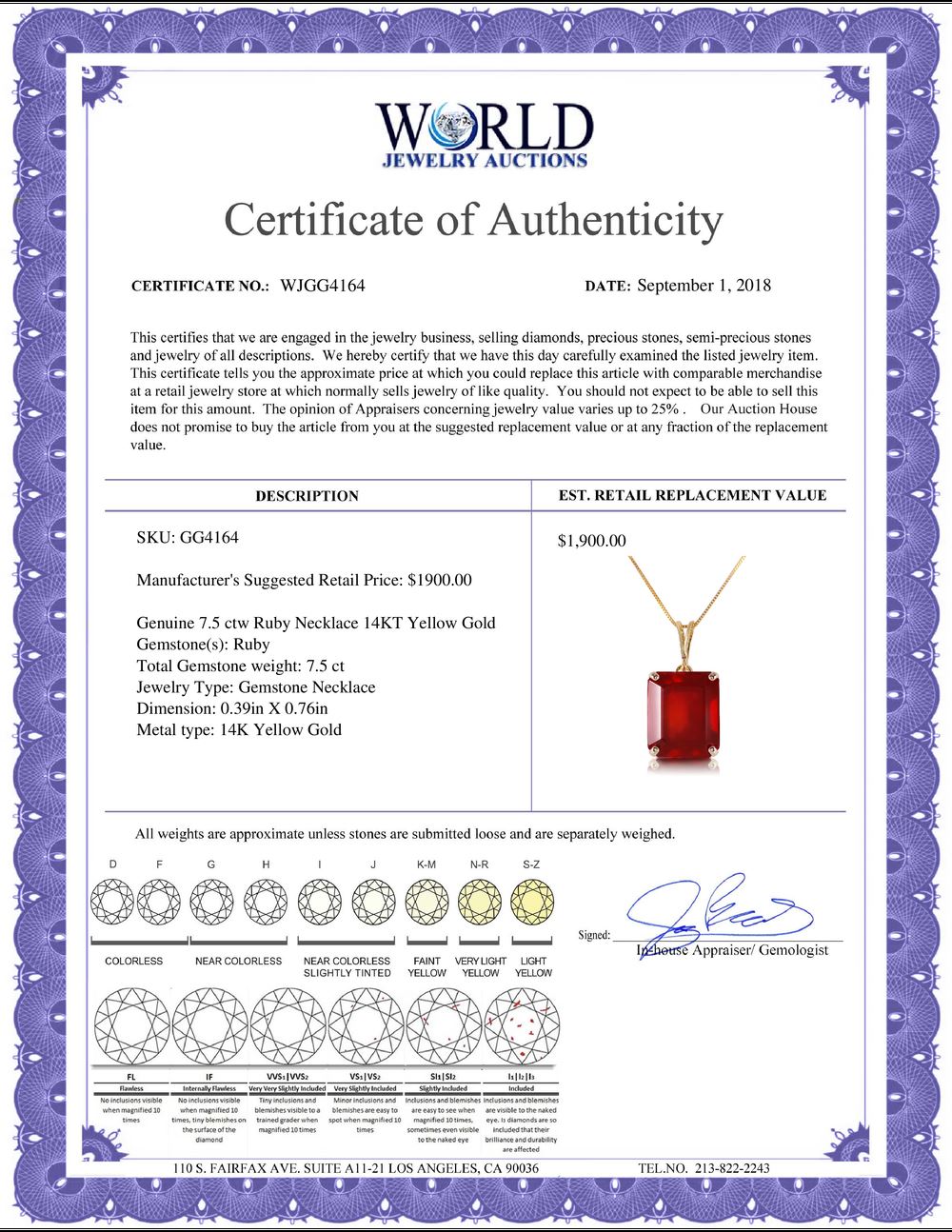 All property is sold “AS IS”, and ALL SALES ARE FINAL. Property is open to thorough public inspection. It is the Bidder’s responsibility to determine condition, age, genuineness, value or any other determinative factor. WJA may attempt to describe the merchandise in advertising and on the Internet but makes no representations. In no event shall WORLD JEWELRY AUCTION be held responsible for having made or implied any warranty of merchantability or fitness for a particular purpose. Bidder shall be the sole judge of value.