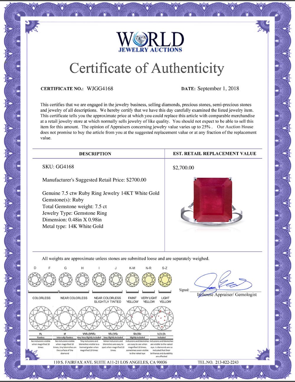 All property is sold “AS IS”, and ALL SALES ARE FINAL. Property is open to thorough public inspection. It is the Bidder’s responsibility to determine condition, age, genuineness, value or any other determinative factor. WJA may attempt to describe the merchandise in advertising and on the Internet but makes no representations. In no event shall WORLD JEWELRY AUCTION be held responsible for having made or implied any warranty of merchantability or fitness for a particular purpose. Bidder shall be the sole judge of value.