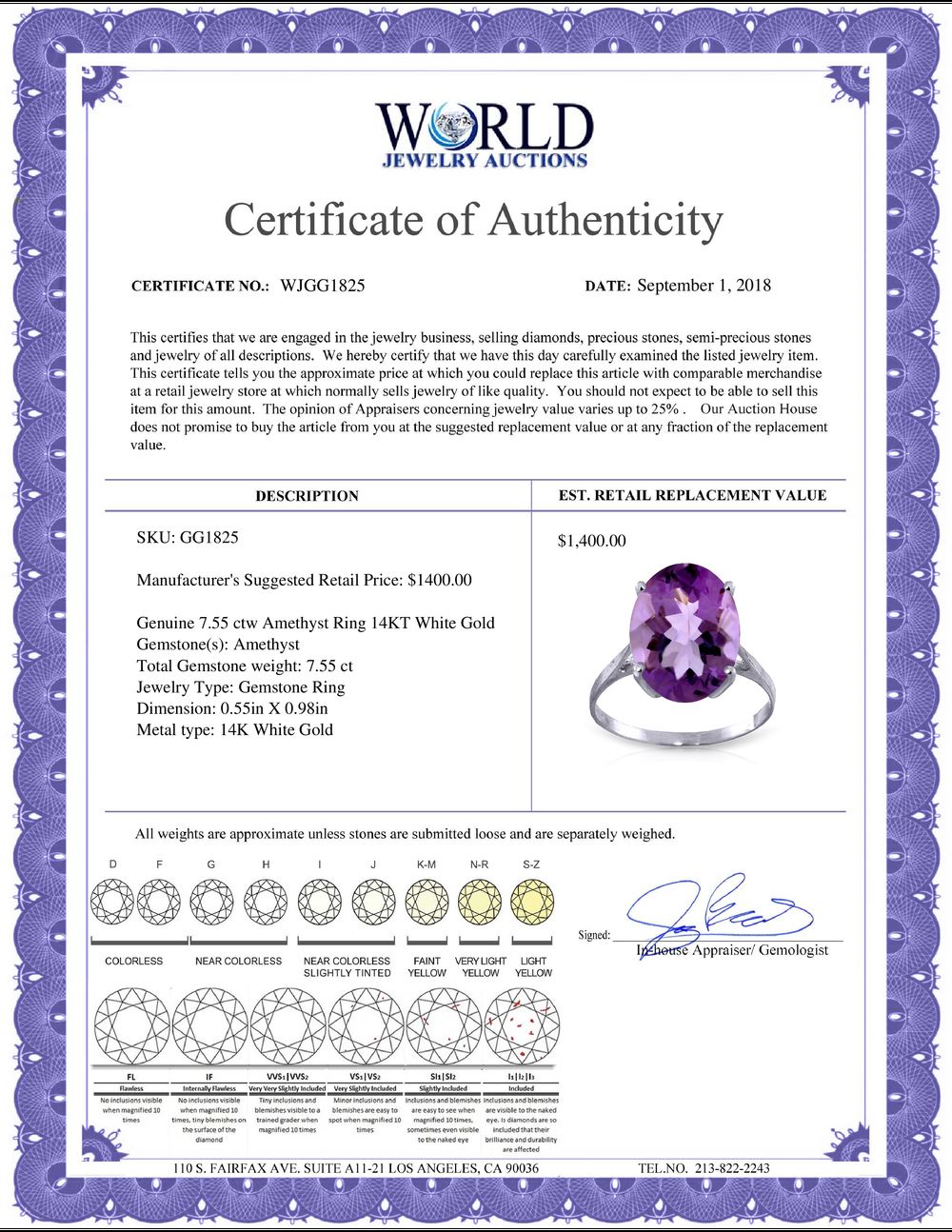All property is sold “AS IS”, and ALL SALES ARE FINAL. Property is open to thorough public inspection. It is the Bidder’s responsibility to determine condition, age, genuineness, value or any other determinative factor. WJA may attempt to describe the merchandise in advertising and on the Internet but makes no representations. In no event shall WORLD JEWELRY AUCTION be held responsible for having made or implied any warranty of merchantability or fitness for a particular purpose. Bidder shall be the sole judge of value.