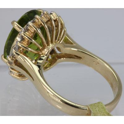 Main Stone: Peridot ; Carat Weight: 7.7ctw ; Gold Carat:14KT; Metal: Yellow Gold ; Ring Size: 5.75 ; Diamond Count: TD.22/RD.46 ; Diamond Weight: 0.68 ; Gemstone Carat Weight: 7.02; Cut: OVAL