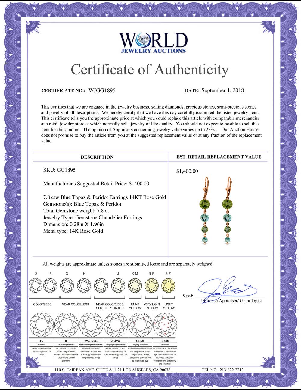 All property is sold “AS IS”, and ALL SALES ARE FINAL. Property is open to thorough public inspection. It is the Bidder’s responsibility to determine condition, age, genuineness, value or any other determinative factor. WJA may attempt to describe the merchandise in advertising and on the Internet but makes no representations. In no event shall WORLD JEWELRY AUCTION be held responsible for having made or implied any warranty of merchantability or fitness for a particular purpose. Bidder shall be the sole judge of value.