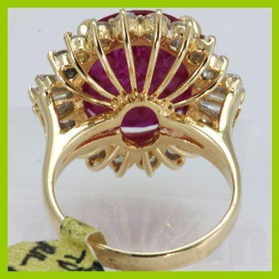 Gemstone: Ruby ; Gemstone Shape: Oval ; Gemstone Size: 14X10 ; Gemstone Weight: 6.8 ; Diamond Count: 16RD ; Diamond Weight: 1.11; Metal Purity: 14KT ; Metal: Yellow Gold ; Ring Size: 6.5