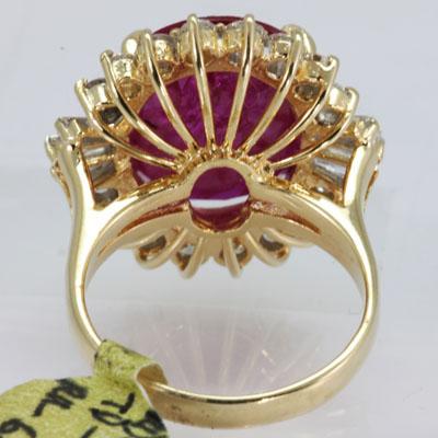 Gemstone: Ruby ; Gemstone Shape: Oval ; Gemstone Size: 14X10 ; Gemstone Weight: 6.8 ; Diamond Count: 16RD ; Diamond Weight: 1.11; Metal Purity: 14KT ; Metal: Yellow Gold ; Ring Size: 6.5