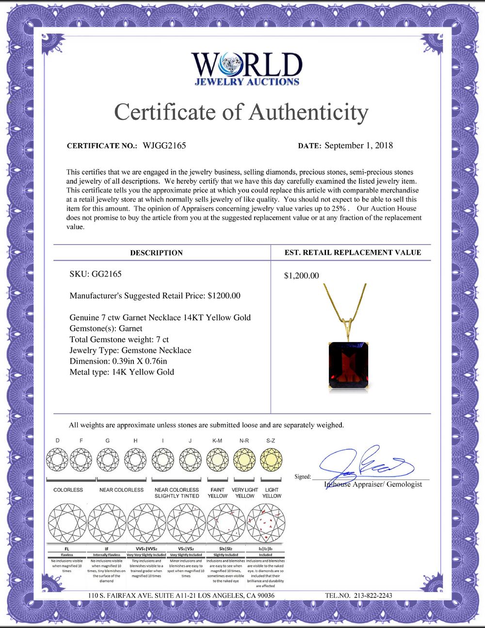 All property is sold “AS IS”, and ALL SALES ARE FINAL. Property is open to thorough public inspection. It is the Bidder’s responsibility to determine condition, age, genuineness, value or any other determinative factor. WJA may attempt to describe the merchandise in advertising and on the Internet but makes no representations. In no event shall WORLD JEWELRY AUCTION be held responsible for having made or implied any warranty of merchantability or fitness for a particular purpose. Bidder shall be the sole judge of value.