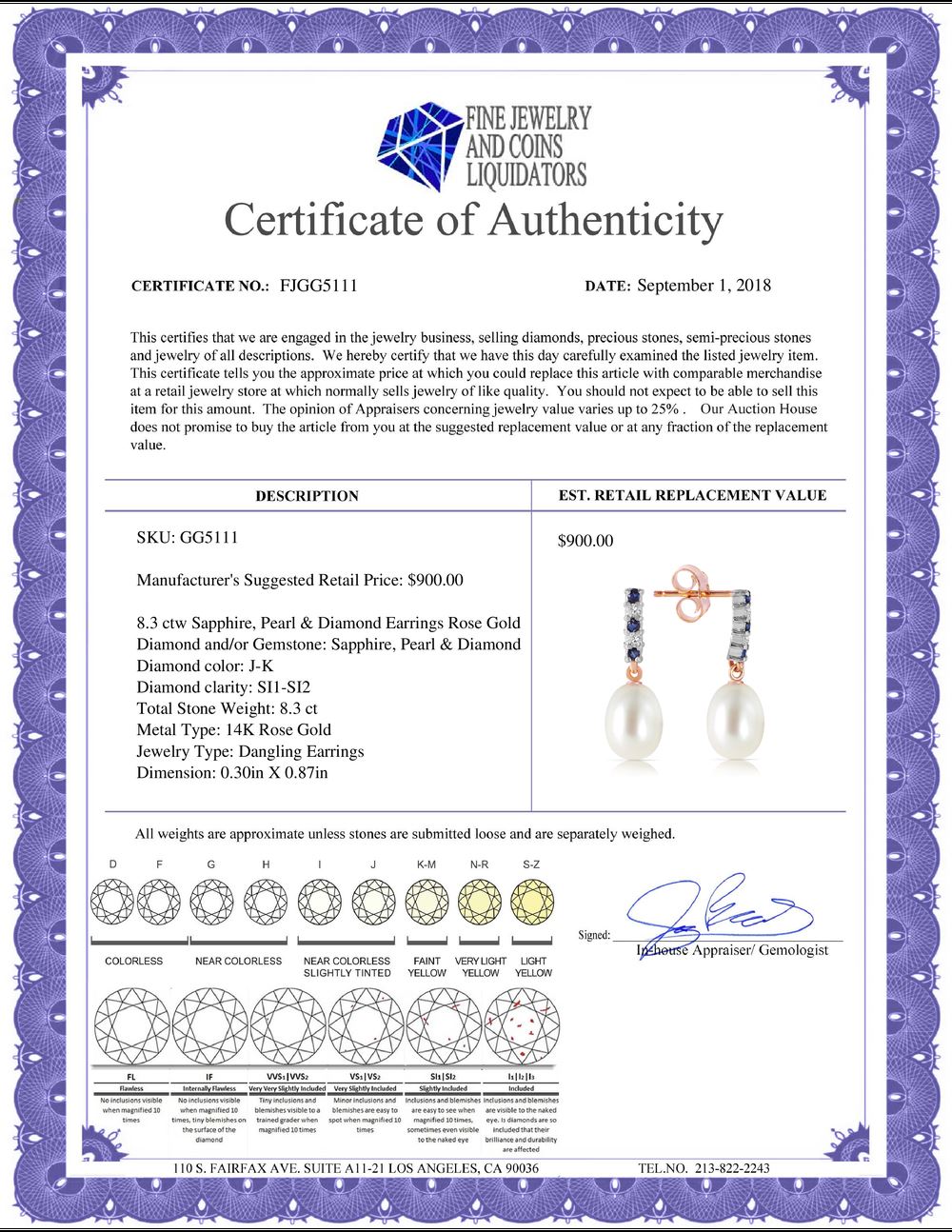 Genuine 8.3 ctw Sapphire, Pearl & Diamond Earrings 14KT Rose Gold - REF-28W8Y