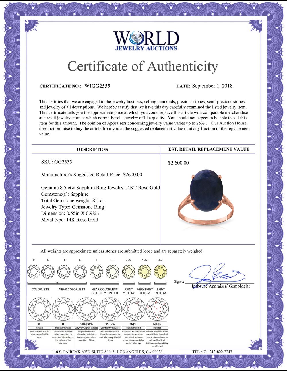REF-85F2Z - SKU: GG2555 ---- Genuine 8.5 ctw Sapphire Ring 14KT Rose Gold