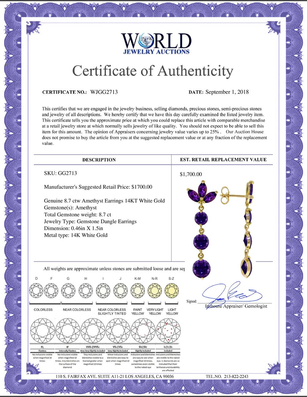 REF-53W6Y - SKU: GG2713 ---- Genuine 8.7 ctw Amethyst Earrings 14KT White Gold