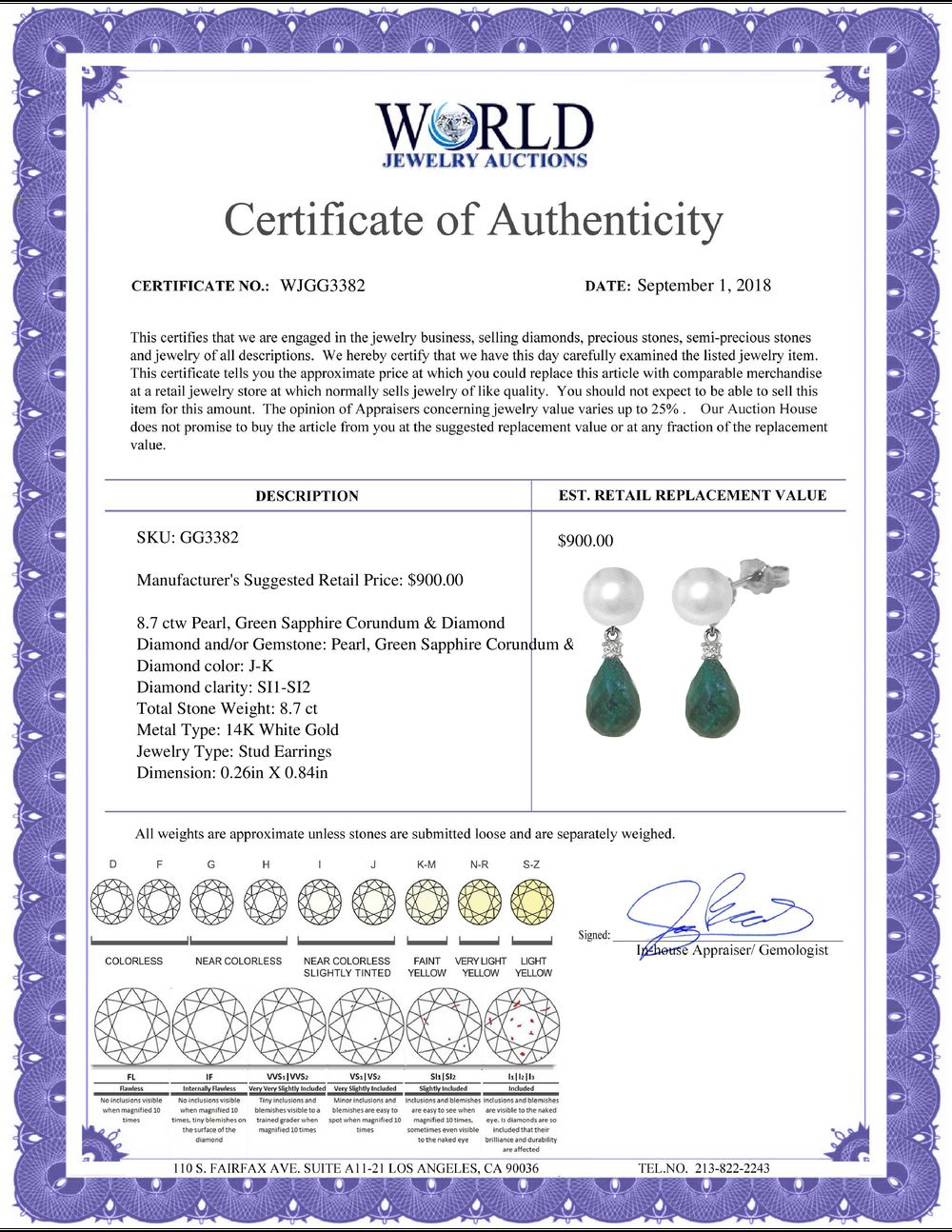 All property is sold “AS IS”, and ALL SALES ARE FINAL. Property is open to thorough public inspection. It is the Bidder’s responsibility to determine condition, age, genuineness, value or any other determinative factor. WJA may attempt to describe the merchandise in advertising and on the Internet but makes no representations. In no event shall WORLD JEWELRY AUCTION be held responsible for having made or implied any warranty of merchantability or fitness for a particular purpose. Bidder shall be the sole judge of value.