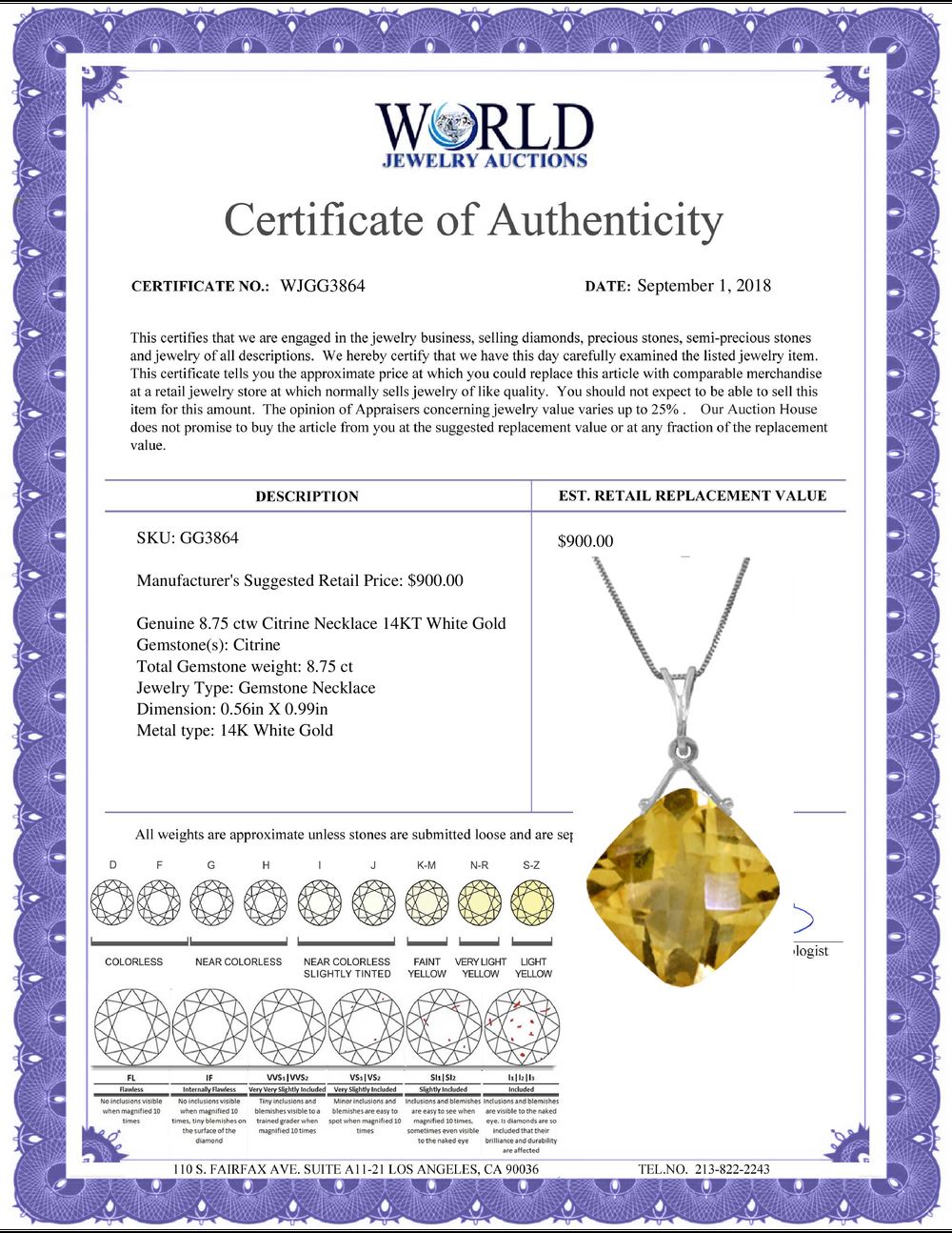 All property is sold “AS IS”, and ALL SALES ARE FINAL. Property is open to thorough public inspection. It is the Bidder’s responsibility to determine condition, age, genuineness, value or any other determinative factor. WJA may attempt to describe the merchandise in advertising and on the Internet but makes no representations. In no event shall WORLD JEWELRY AUCTION be held responsible for having made or implied any warranty of merchantability or fitness for a particular purpose. Bidder shall be the sole judge of value.