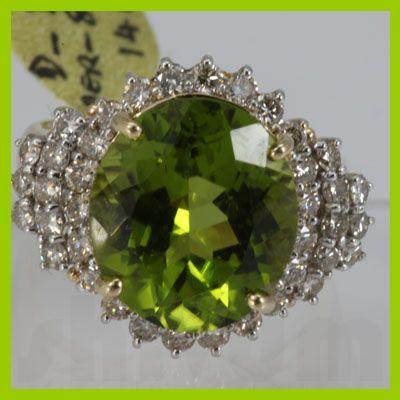 Main Stone: Peridot ; Carat Weight: 8.88ctw ; Gold Carat:14KT; Metal: Yellow Gold ; Ring Size: 6.5 ; Diamond Count: TD.95 ; Diamond Weight: 0.95 ; Gemstone Carat Weight: 7.93; Cut: OVAL