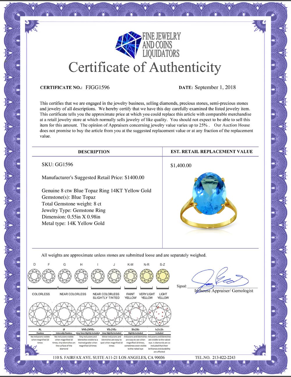REF-46M2T - SKU: GG1596 ---- Genuine 8 ctw Blue Topaz Ring 14KT Yellow Gold