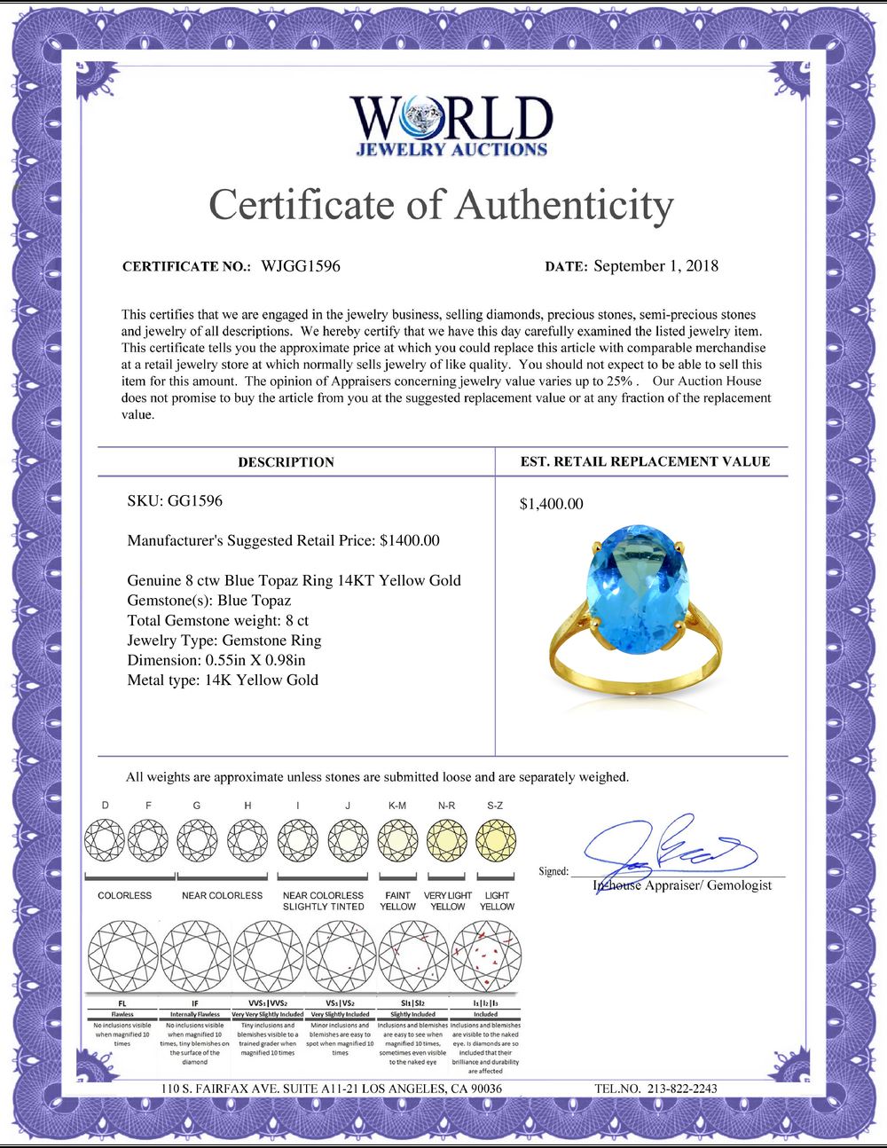 REF-46M2T - SKU: GG1596 ---- Genuine 8 ctw Blue Topaz Ring 14KT Yellow Gold
