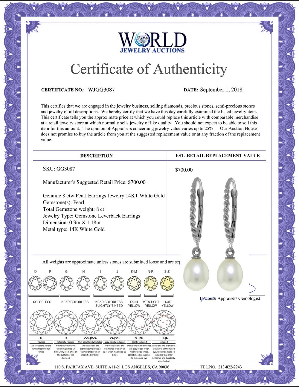 REF-22Z5N - SKU: GG3087 ---- Genuine 8 ctw Pearl Earrings 14KT White Gold