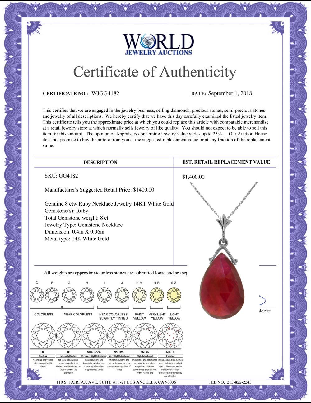 All property is sold “AS IS”, and ALL SALES ARE FINAL. Property is open to thorough public inspection. It is the Bidder’s responsibility to determine condition, age, genuineness, value or any other determinative factor. WJA may attempt to describe the merchandise in advertising and on the Internet but makes no representations. In no event shall WORLD JEWELRY AUCTION be held responsible for having made or implied any warranty of merchantability or fitness for a particular purpose. Bidder shall be the sole judge of value.