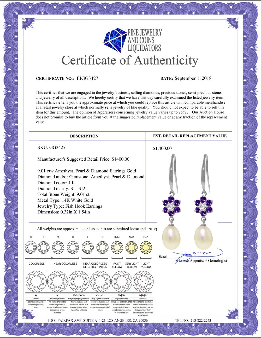 REF-44M3T - SKU: GG3427 ---- Genuine 9.01 ctw Amethyst, Pearl & Diamond Earrings 14KT White Gold