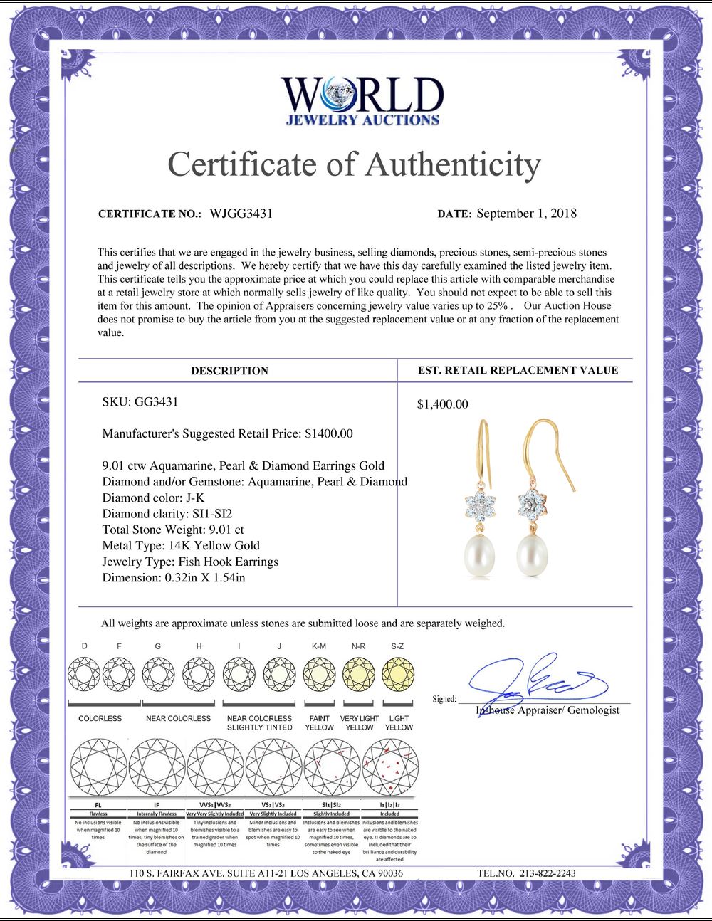 All property is sold “AS IS”, and ALL SALES ARE FINAL. Property is open to thorough public inspection. It is the Bidder’s responsibility to determine condition, age, genuineness, value or any other determinative factor. WJA may attempt to describe the merchandise in advertising and on the Internet but makes no representations. In no event shall WORLD JEWELRY AUCTION be held responsible for having made or implied any warranty of merchantability or fitness for a particular purpose. Bidder shall be the sole judge of value.