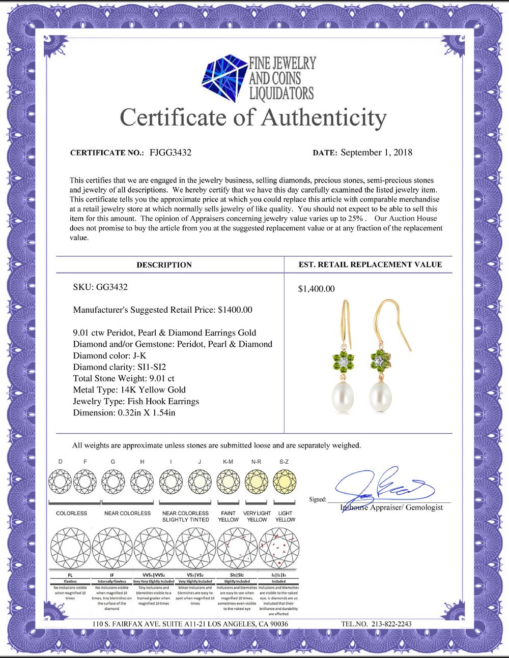 Genuine 14K White Gold 9.01 ctw Peridot, Pearl & Diamond Earrings