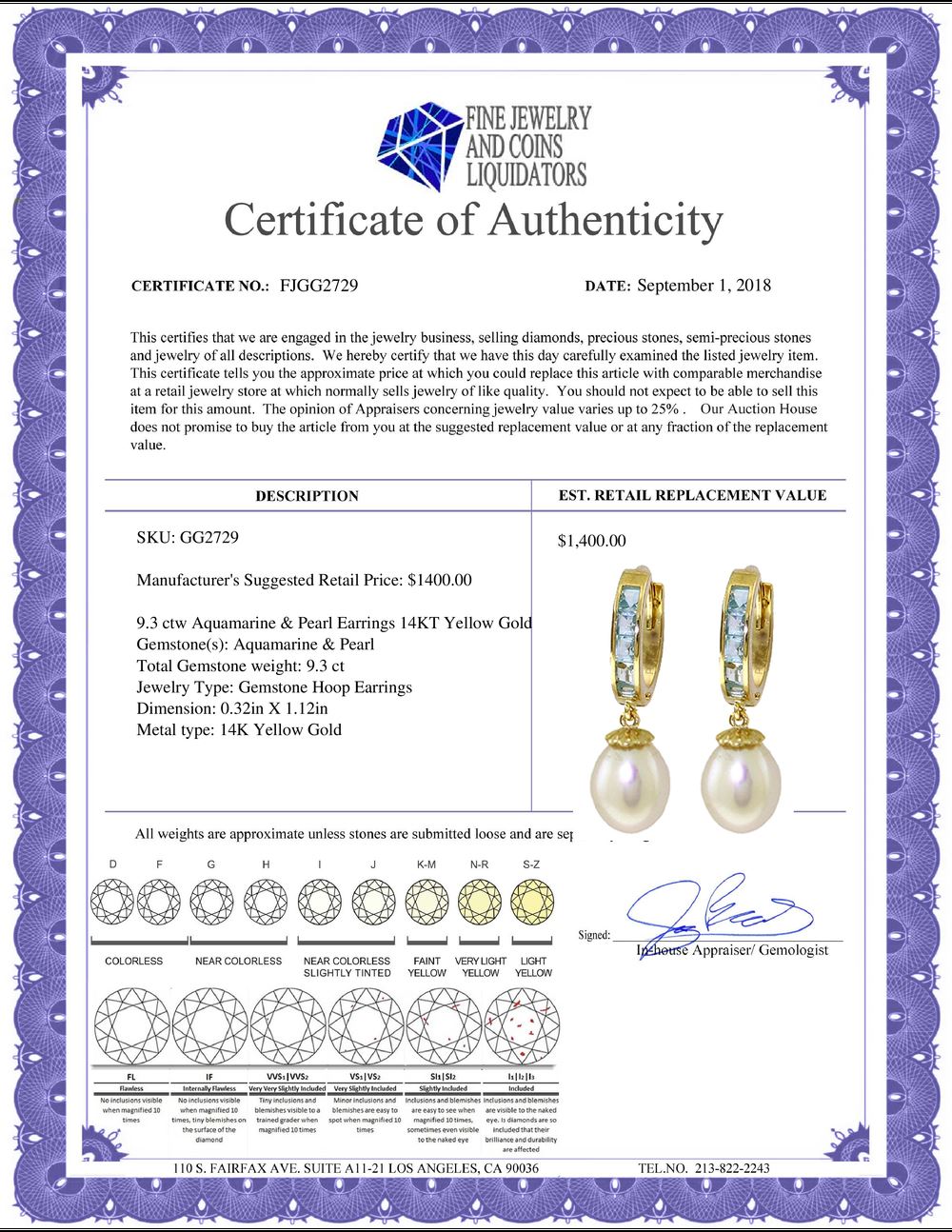 Genuine 14K Yellow Gold 9.3 ctw Aquamarine & Pearl Earrings