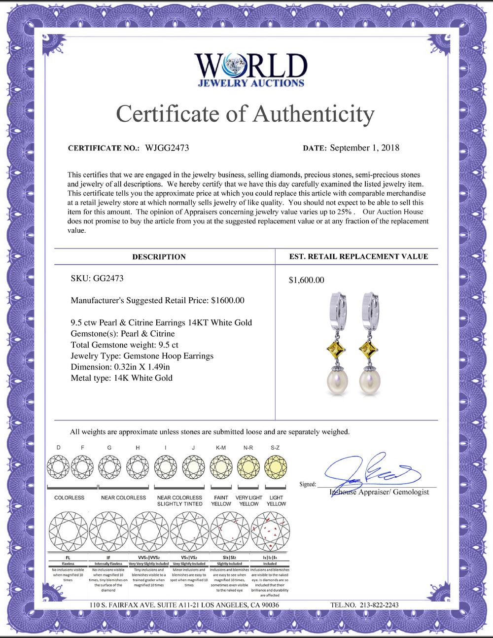 All property is sold “AS IS”, and ALL SALES ARE FINAL. Property is open to thorough public inspection. It is the Bidder’s responsibility to determine condition, age, genuineness, value or any other determinative factor. WJA may attempt to describe the merchandise in advertising and on the Internet but makes no representations. In no event shall WORLD JEWELRY AUCTION be held responsible for having made or implied any warranty of merchantability or fitness for a particular purpose. Bidder shall be the sole judge of value.