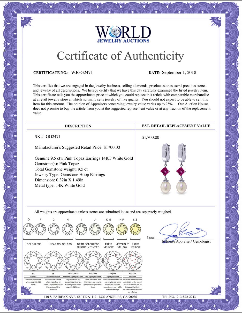 All property is sold “AS IS”, and ALL SALES ARE FINAL. Property is open to thorough public inspection. It is the Bidder’s responsibility to determine condition, age, genuineness, value or any other determinative factor. WJA may attempt to describe the merchandise in advertising and on the Internet but makes no representations. In no event shall WORLD JEWELRY AUCTION be held responsible for having made or implied any warranty of merchantability or fitness for a particular purpose. Bidder shall be the sole judge of value.
