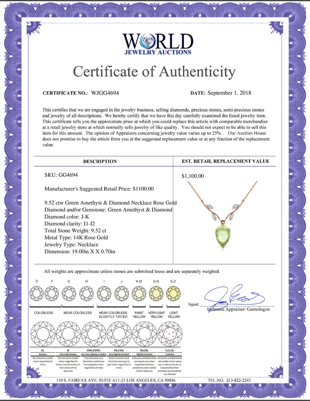 All property is sold “AS IS”, and ALL SALES ARE FINAL. Property is open to thorough public inspection. It is the Bidder’s responsibility to determine condition, age, genuineness, value or any other determinative factor. WJA may attempt to describe the merchandise in advertising and on the Internet but makes no representations. In no event shall WORLD JEWELRY AUCTION be held responsible for having made or implied any warranty of merchantability or fitness for a particular purpose. Bidder shall be the sole judge of value.