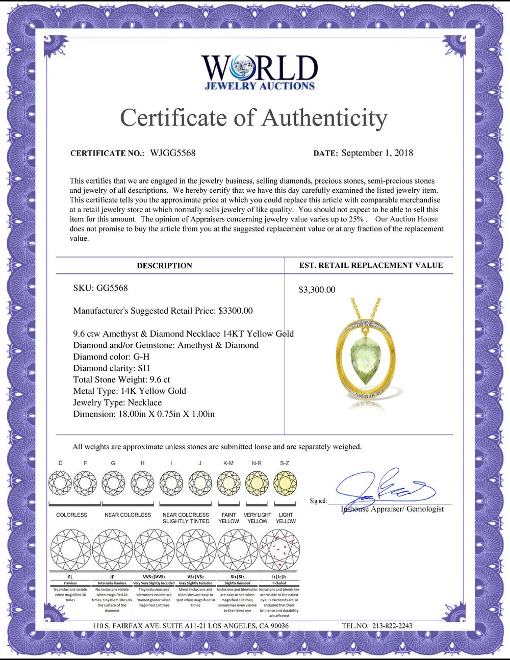 All property is sold “AS IS”, and ALL SALES ARE FINAL. Property is open to thorough public inspection. It is the Bidder’s responsibility to determine condition, age, genuineness, value or any other determinative factor. WJA may attempt to describe the merchandise in advertising and on the Internet but makes no representations. In no event shall WORLD JEWELRY AUCTION be held responsible for having made or implied any warranty of merchantability or fitness for a particular purpose. Bidder shall be the sole judge of value.