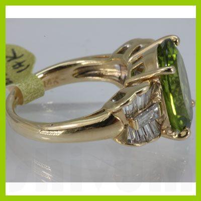 Main Stone: Peridot ; Carat Weight: 9.96ctw ; Gold Carat:14KT; Metal: Yellow Gold ; Ring Size: 5 ; Diamond Weight: 1.26 ; Gemstone Carat Weight: 8.7; Cut: OVAL