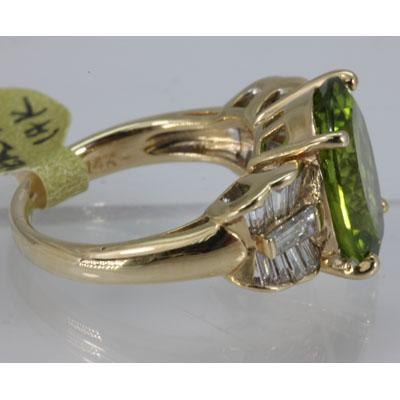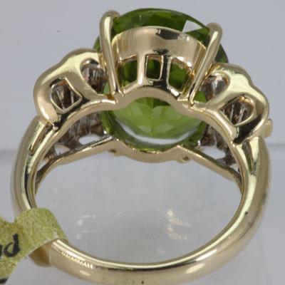 Main Stone: Peridot ; Carat Weight: 9.96ctw ; Gold Carat:14KT; Metal: Yellow Gold ; Ring Size: 5 ; Diamond Weight: 1.26 ; Gemstone Carat Weight: 8.7; Cut: OVAL