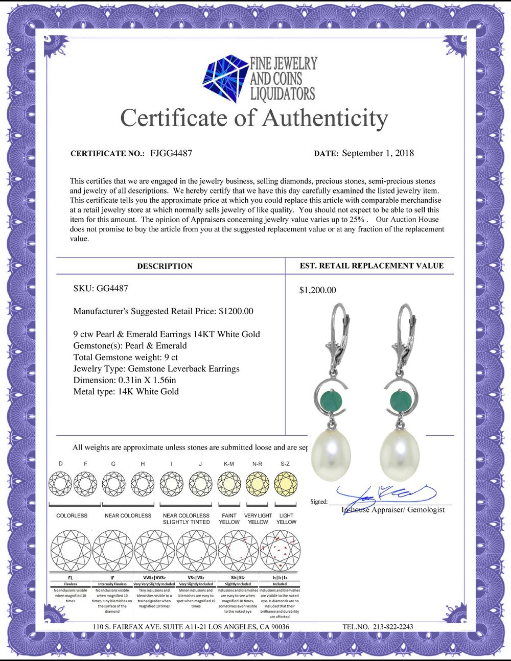 REF-39X4M - SKU: GG4487 ---- Genuine 9 ctw Pearl & Emerald Earrings 14KT White Gold