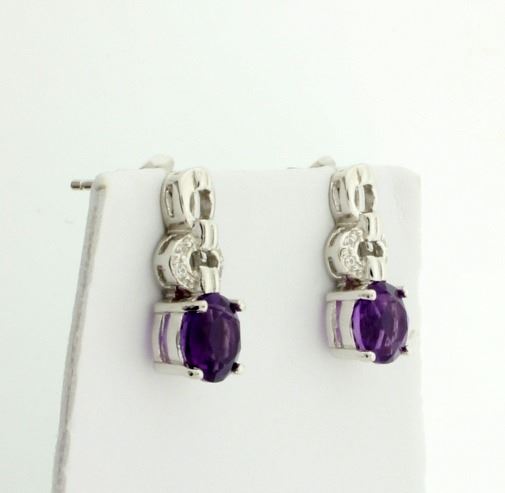 Genuine 7mm round Amethyst gemstone dangle earrings accented with White Sapphire gems, set in sterling silver with friction backs. The gem Amethysts have a beautiful color. 3g.