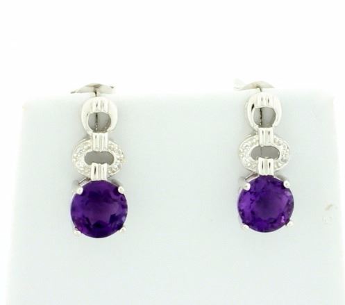 Genuine 7mm round Amethyst gemstone dangle earrings accented with White Sapphire gems, set in sterling silver with friction backs. The gem Amethysts have a beautiful color. 3g.