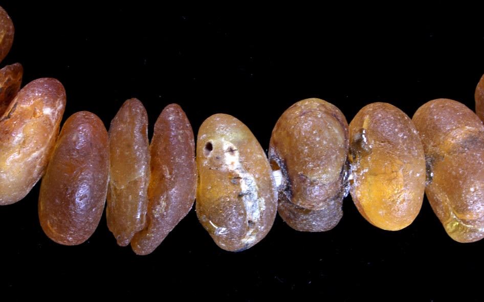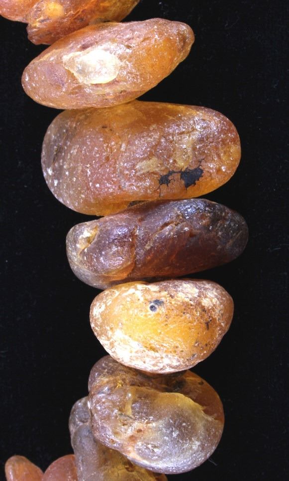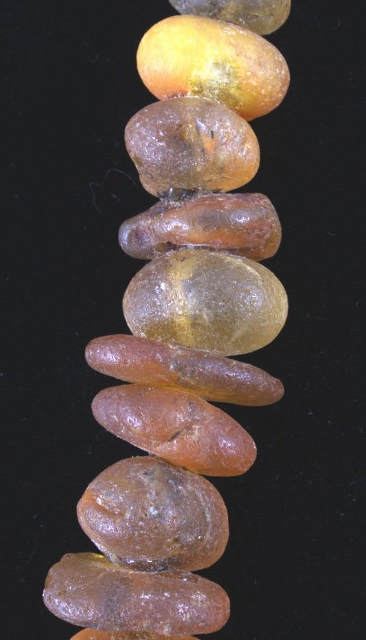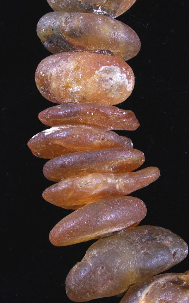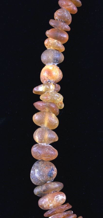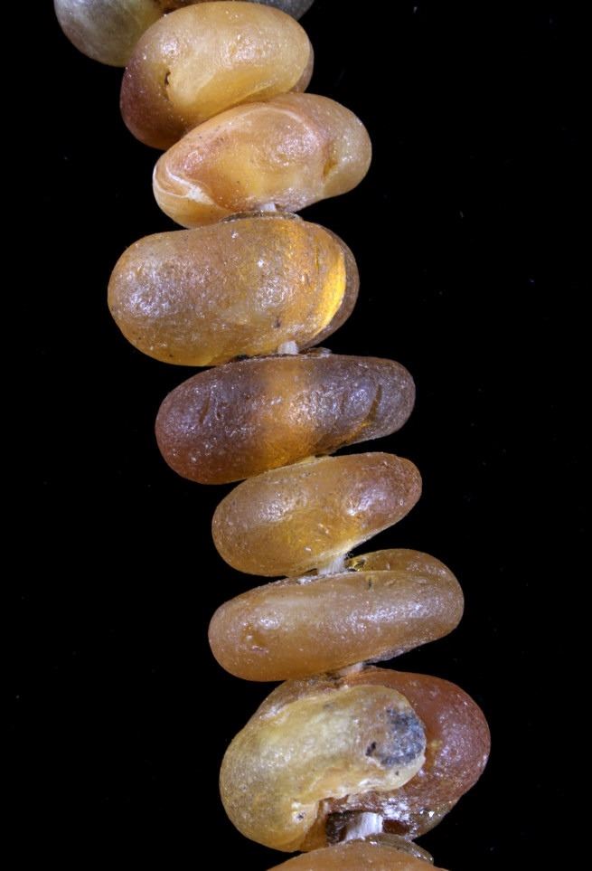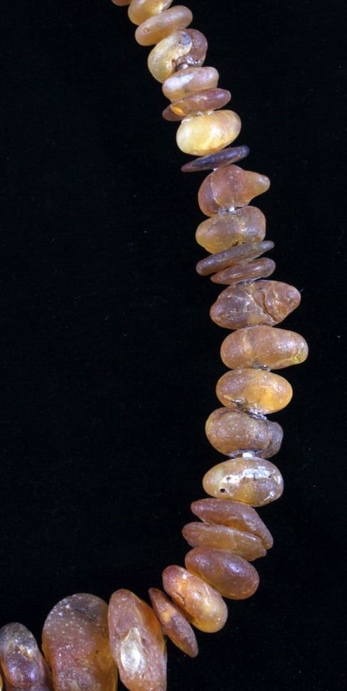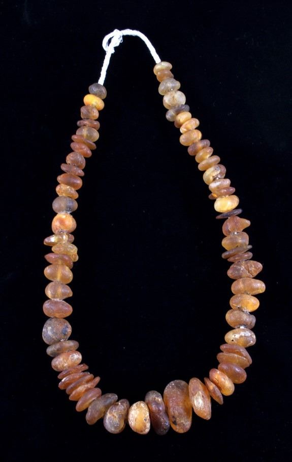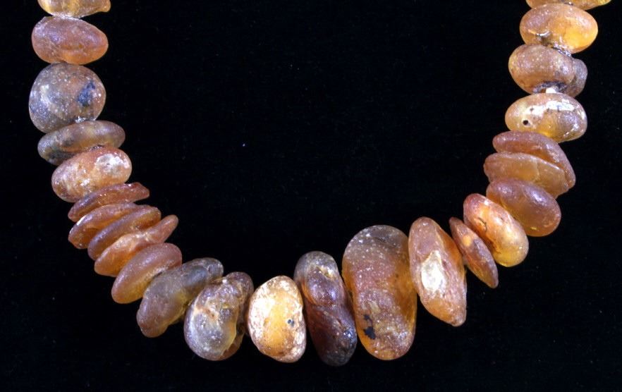 This is a genuine ancient amber necklace. The necklace features graduated beads made from amber strung with cotton fiber string. The amber has been examined and tested by an expert and is guaranteed to be authentic. The necklace shows good condition. It measures 34" long.