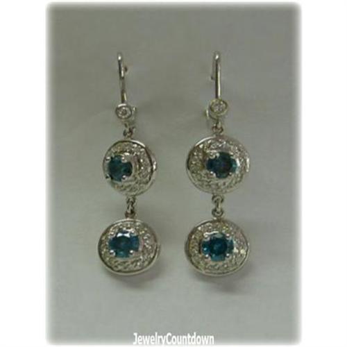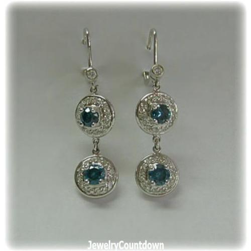 Stunning Blue Diamonds are surrounded by sparkling White Diamonds and set in solid 14 Karat White Gold. These rare blue diamonds are more beautiful than sapphires. Photos can not capture their true, deep color. Please see specifications below.<BR><BR>Please note: our merchandise is guaranteed 100% to your satisfaction. If you DON'T LOVE this item, simply return it within 14 days for a complete refund of your purchase price. BONDED SELLER.<p> * Insurance is included in our Domestic Shipping charges: $6 for first item and $3 for each additional item.<BR><BR>Total Weight per pair: 6 grams<BR><BR>Length: 1.5 Inches (32mm)<BR><BR>Width: 3/8 Inch (10mm)<BR><BR>Setting: Solid 14 Karat White Gold<BR><BR>Diamond Weight: 1 Carat Total Weight<BR><BR>Diamond Clarity: I1 <BR><BR>Diamond Color: (Fancy) Blue and (White) I