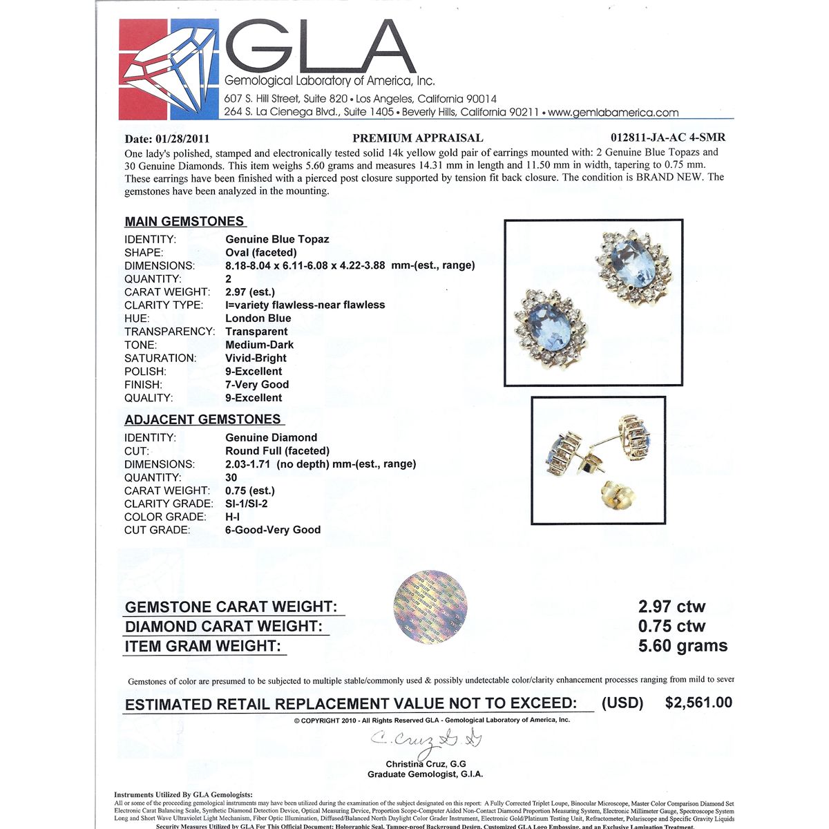Genuine Blue Topaz 3.72 ctw & Diamond Earring 14KTGold **|**|** Main Stone: Blue Topaz; Total CTW: 3.72 ctw ; Metal Purity: 14KTGold ; Diamond Count 1: 30 Roundcut; Diamond CTW 1: 0.75; Clarity: SI-I ; Diamond Color: H-I; Gemstone Count: 2 OvalCut ; Gemstone Carat Weight: 2.97; Gemstone Color: London-Blue; Availability: 3-10 Business days, ready to ship, with certification of appraisal will take 2 weeks. ; MSRP: $2400