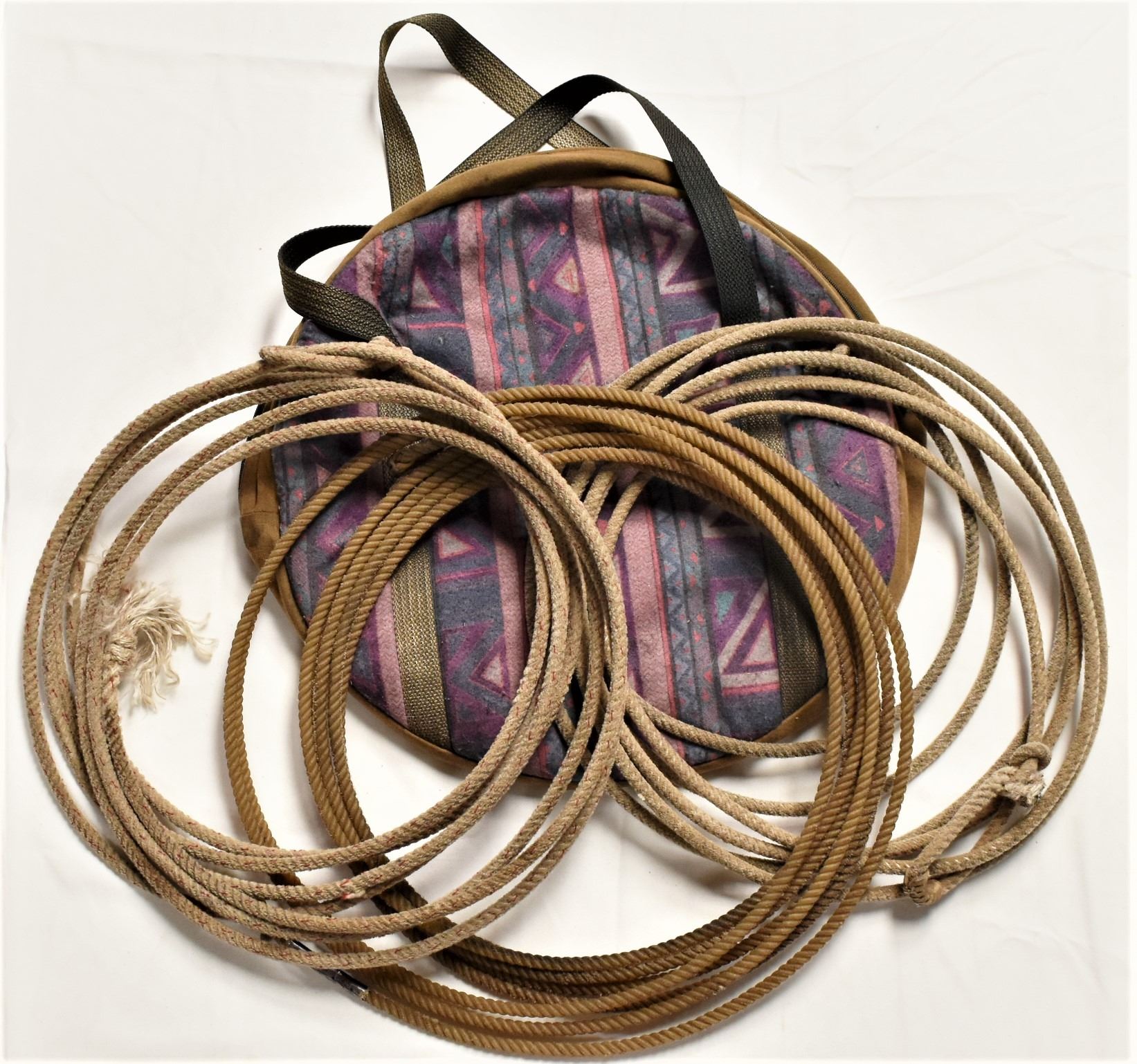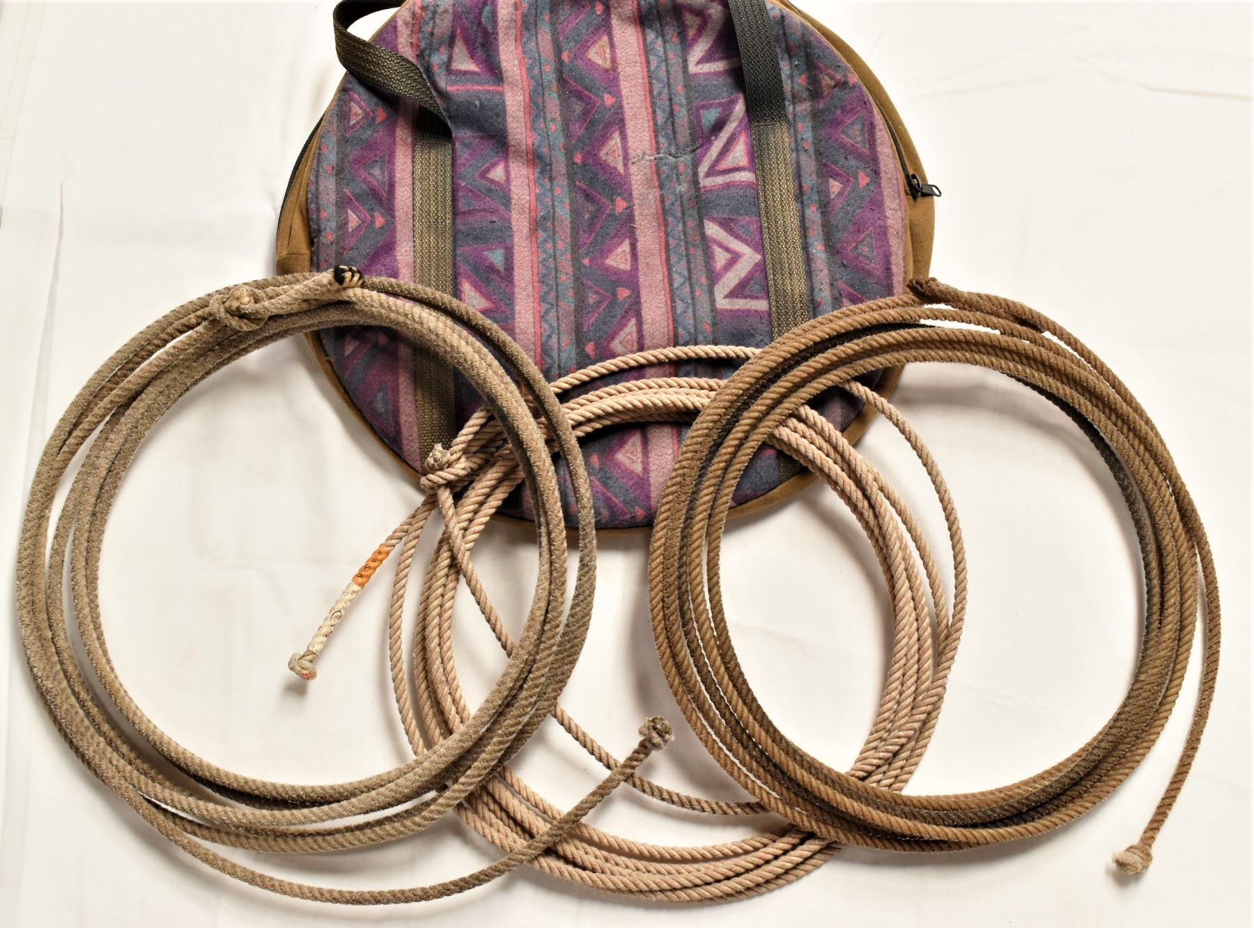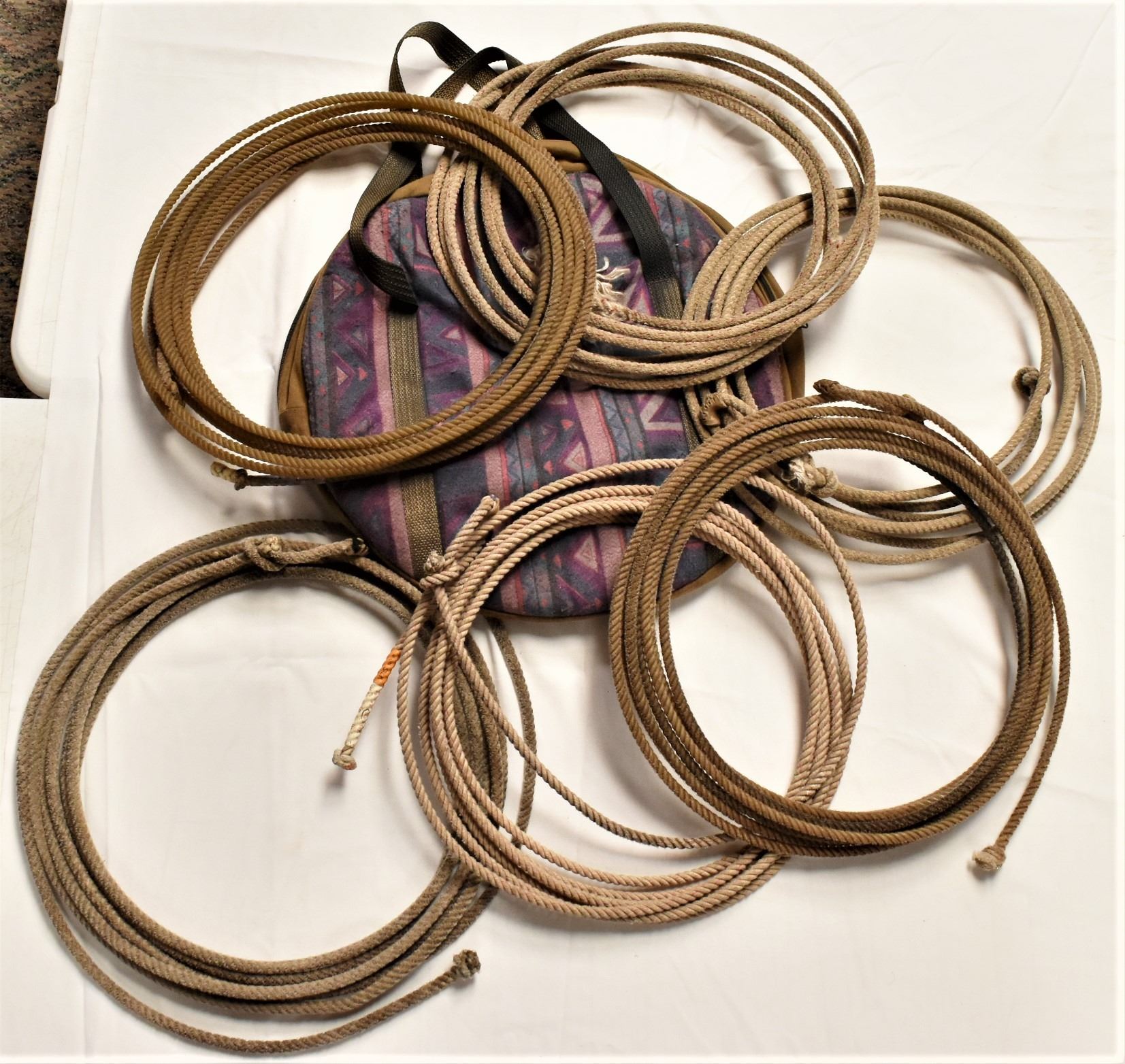 Genuine Cowboy Rope Bag with 6 Lasso Ropes, ropes are various lengths, bag measures 20.5''D and has double handles