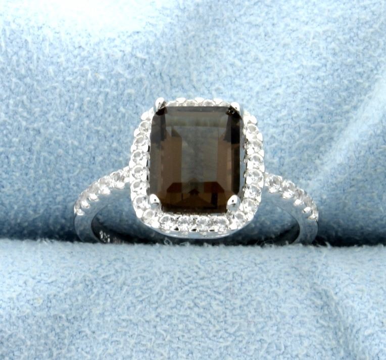 Genuine 9x7mm emerald cut deep Citrine gemstone ring surrounded by genuine White Sapphire gems, mounted in sterling silver for a timeless design. Size 7. 2.6g.
