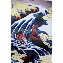 WATERFALL AND HORSE CLEANING **|**|** 13x19in; unframed; This poster by Katsushika Hokusai is of a waterfall with men washing a horse. Katsushika Hoku