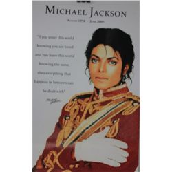MICHAEL JACKSON LOVED QUOTED **|**|** 11X17INCHES; UNFRAMED; This poster shows Michael Jackson in a red, military-style jacket and white sequined glo