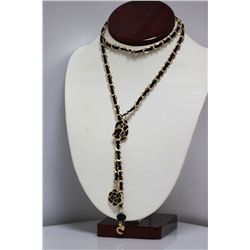 CHANEL STYLE BLACK LEATHER GOLD PLATED LONG NECKLACE