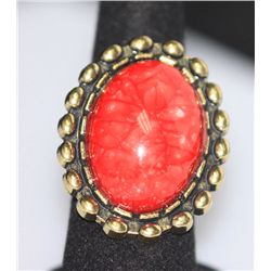 FASHION JEWELRY BRASS RING; SYNTHETIC RED STONE **|**|** FASHION JEWELRY BRASS RING; OVAL SHAPED; FRAYED EDGES; SYNTHETIC RED STONE ; MSRP: $0