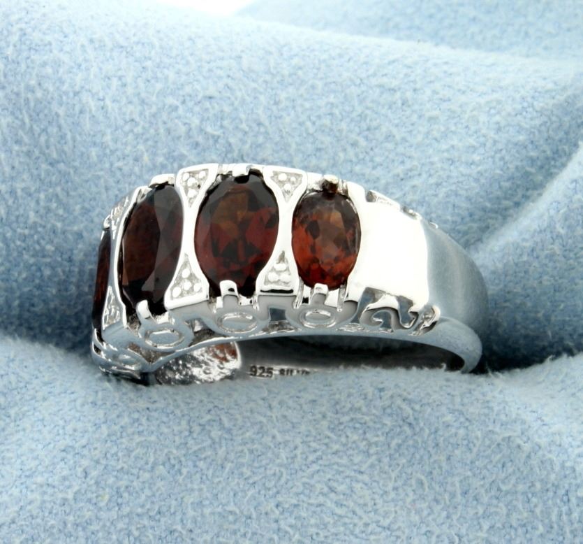 This ring holds 5 genuine Garnet Gemstones (1-6x8, 2-5x7, 2-4x6) that have a gorgeous red color. The workmanship on the sides of the ring is spectacular, and this ring makes a statement from any angle. The Sterling Silver is plated with Rhodium for extra bright shine! Size 8 6.2g