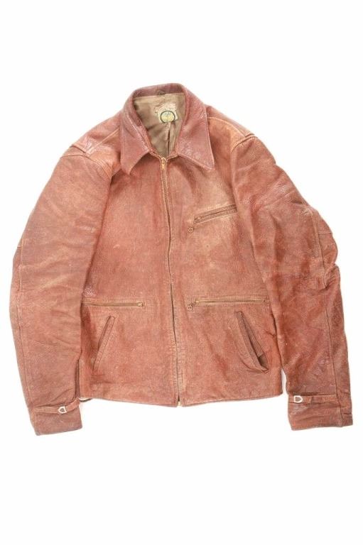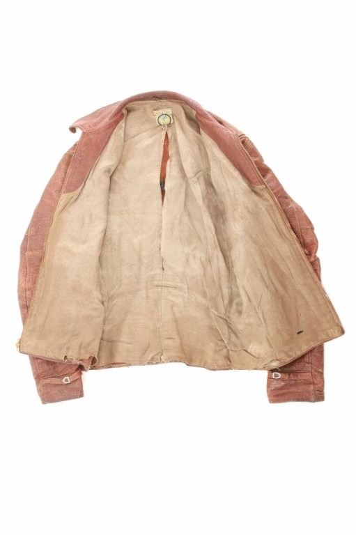 Featured in this lot is this genuine goatskin leather jacket by Knopf. The jacket features a wonderfully and professionally crafted goatskin construction that shows a light brown coloration and features a total of three zip up pockets and two coat pockets and features unique clasp adjustable straps to the sides of the jacket and to the sleeves of the jacket. The tag reads as follows: Genuine Goatskin - Styled by Knopf. The condition of this jacket is good with a tear in the inner lining of the jacket and shows some wear to the goatskin leather consistent with the age but otherwise shows good overall condition. The measurements of this jacket is 29" x 28".