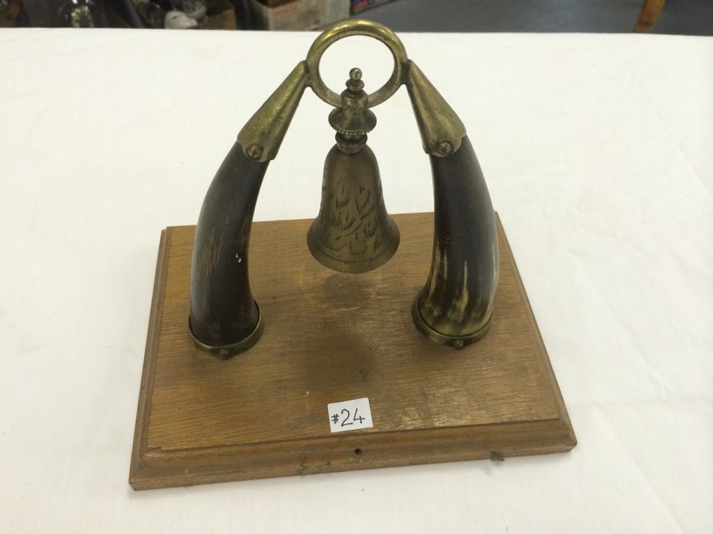Genuine Horns Mounted With Brass Bell on Wood Base