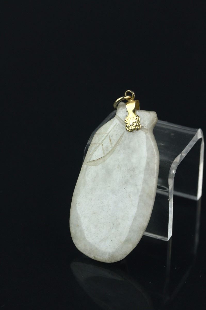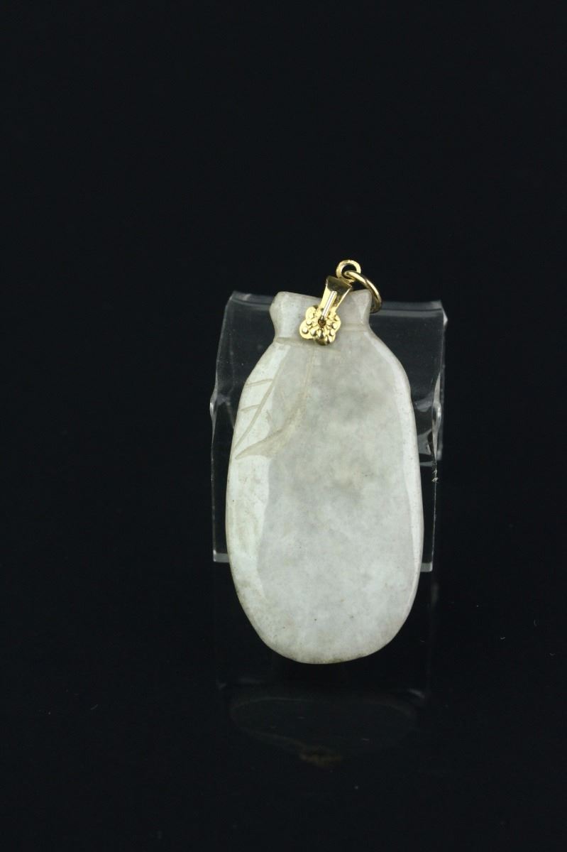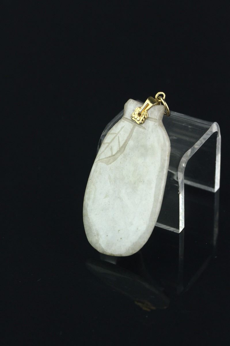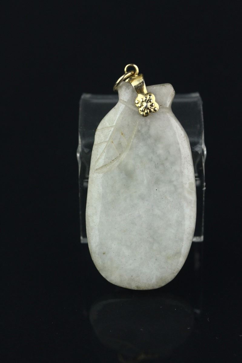 Grey jade pendant; of oval shaped body with leafy carvings; pierced with bail; L: 4.6 cm, W: 2.1 cm, 8.45 grams