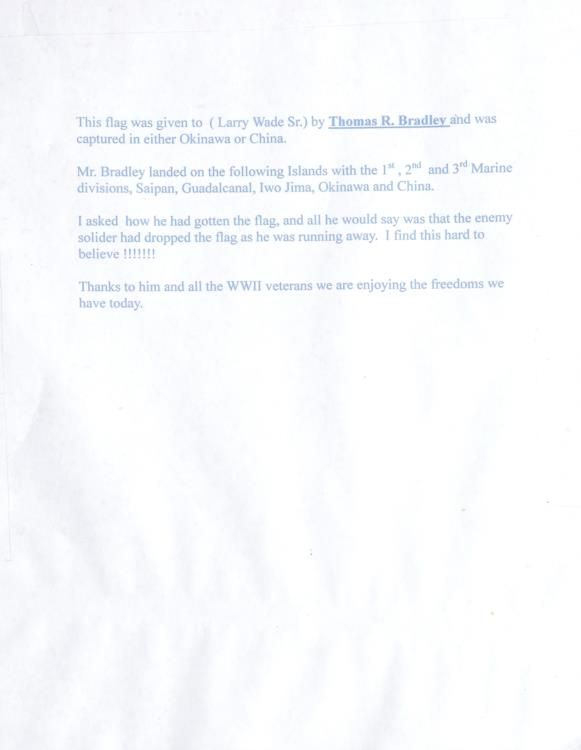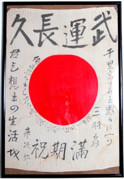 Genuine Japanese WWII Flag Capture Okinawa FramedIncludes write-up that translates the writing on the flag, as well as a written provenance from Larry Wade Sr. (See attached photos).The flag measures 26" x 28" and the frame measures 28" x 41".