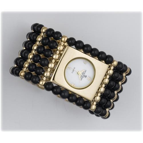 This exquisite watch is fashioned from genuine Onyx beads and is plated with 14K gold. The square bezel and Onyx bead band create a feminine, stylish watch. Comfortable, wide, adjustable bangle band fits all wrists. Includes 1 year Manuf. Warranty. <BR><BR>Width: 1.25 Inches<BR><BR>Face Diameter: 5/8 Inch<BR><BR>Finish: 14K Gold Plating<BR><BR>Semiprecious Beads: Green Onyx<BR><BR>Approx. Weight: 2.2 oz. (63 grams)<BR><BR>Watch is water resistant and timing element is quartz crystal.